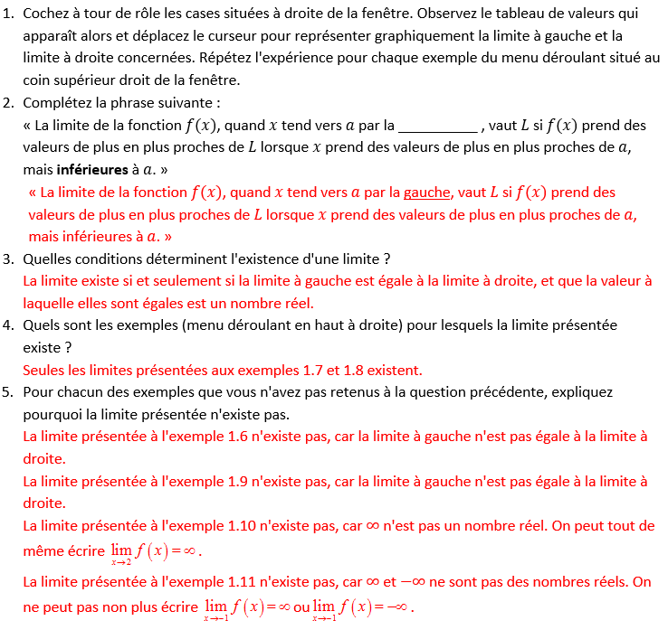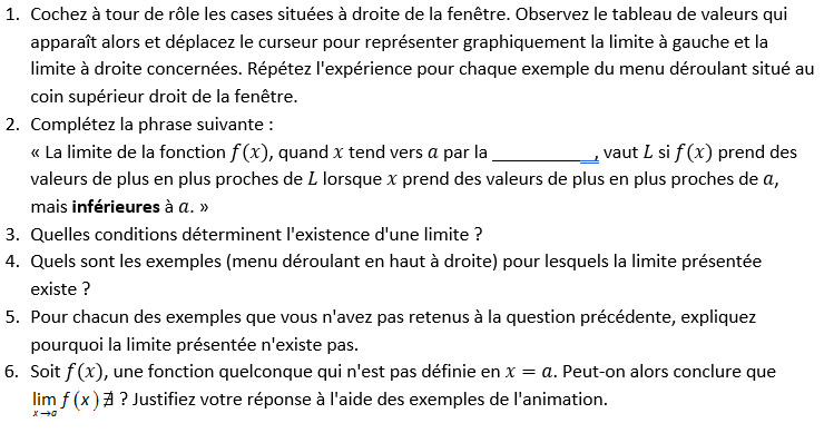 Première d’une série de trois animations explorant l’estimation d’une limite à l’aide d’un graphique ou d’un tableau de valeurs. Cette animation présente les concepts de limite finie ou infinie (exemples 1.6 à 1.11) en vous offrant la possibilité de manipuler la valeur de x pour la faire tendre, par la gauche ou la droite, vers la valeur prédéterminée.