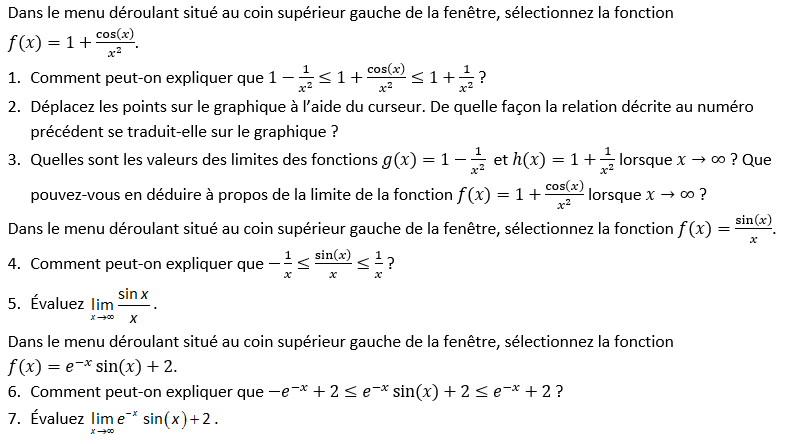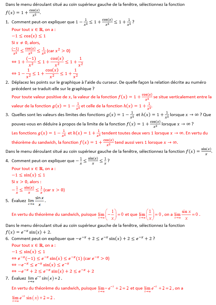Visualisation de la démarche associée à l’application du théorème du sandwich sur une fonction. En présentant, sur un même graphique, la fonction traitée et celles associées aux bornes inférieure et supérieure utilisées lors de l’application du théorème du sandwich, cette animation ajoute un soutien visuel facilitant la compréhension de ce théorème et de son application. De plus, vous pouvez manipuler un point sur la fonction afin de comprendre l’influence de la limite sur son comportement.