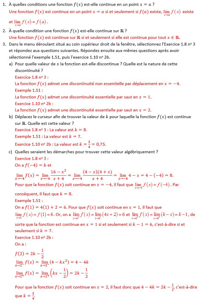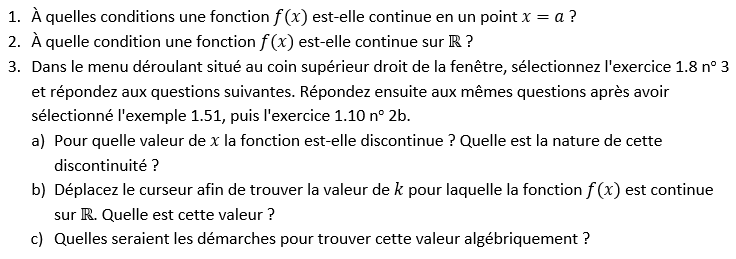 Cette animation vise à vous aider à mieux comprendre le concept de continuité pour une fonction définie par parties. À l’aide d’un curseur, vous pourrez trouver la valeur de la constante permettant d’obtenir une fonction continue. L’animation est associée aux exercices 1.8 no 3 et 1.10 no 2b ainsi qu’à l’exemple 1.51.