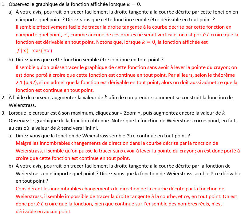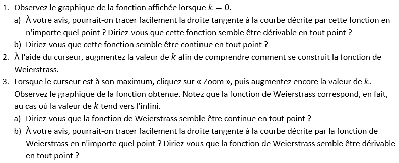 Premier exemple d’une fonction réelle qui est continue partout mais dérivable nulle part. Puisque le but est de montrer comment est construite la fonction, un curseur permet de faire varier le nombre de termes constituant la fonction. Vous aurez ainsi une meilleure idée de la complexité de la fonction après le passage à la limite.