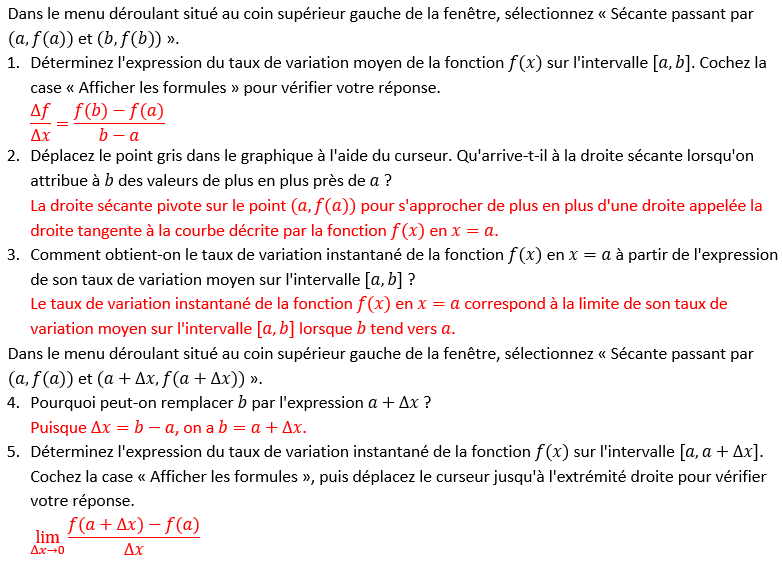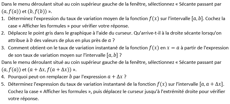 Introduction des formules utilisées dans le calcul du taux de variation instantané. Cette animation reprend la figure 2.5 en vous permettant de faire glisser le point (b, f(b)) sur la fonction afin de le rapprocher du point (a, f(a)) et ainsi d’identifier plus facilement chacune des parties des formules.