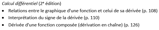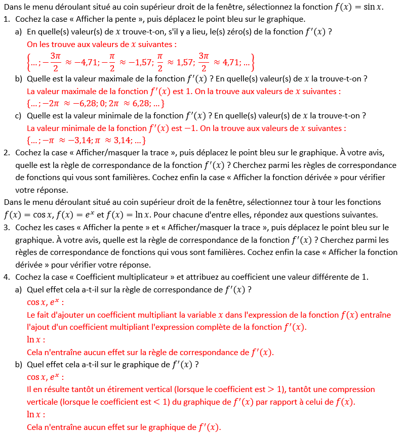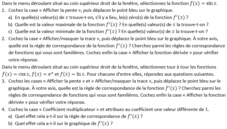 Avant d’aborder les formules de dérivation des fonctions transcendantes sin(x), cos(x), ex et ln(x), vous pourrez utiliser cette animation pour explorer le graphique de ces fonctions et vous faire une idée intuitive des fonctions dérivées associées. À cette fin, il sera possible de déplacer un point sur la fonction et d’afficher la pente de la tangente à ce point.