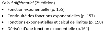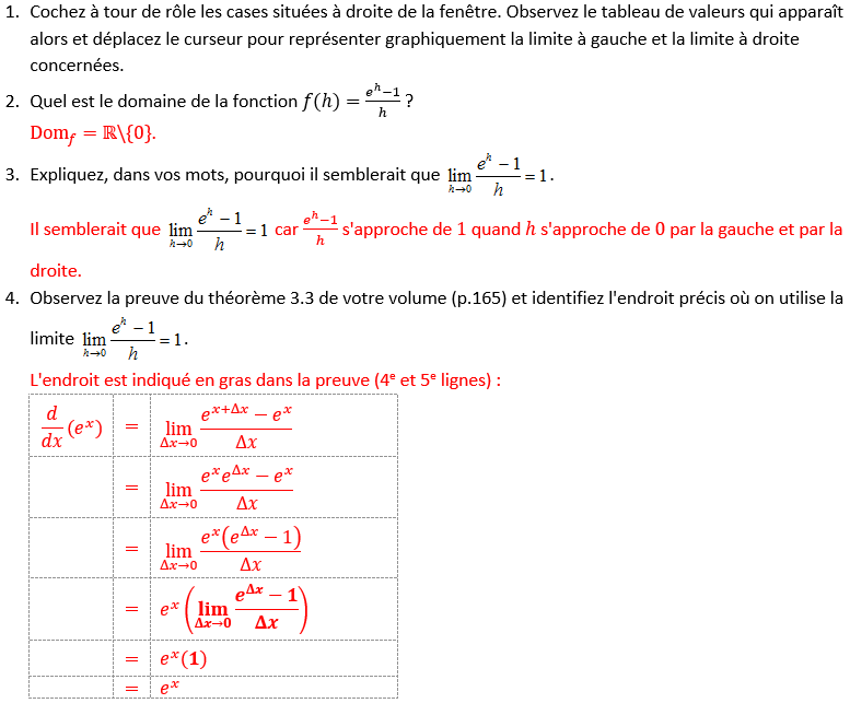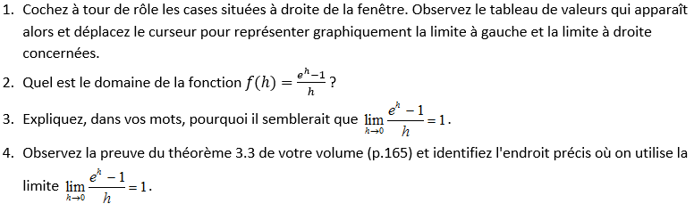 Cette animation vise à vous convaincre de la valeur de la limite de (eh- 1)/h lorsque h → 0 qui est utilisée dans la démonstration du théorème 3.3. On y présente le graphique et le tableau de valeur de la fonction tout en vous permettant de manipuler la valeur de h afin de l’approcher, par la gauche ou la droite, de 0.