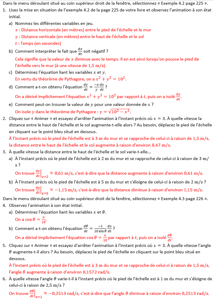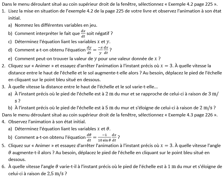 La compréhension des exemples 4.2 et 4.3 est facilitée par l’utilisation de cette animation, dans laquelle il est possible de visualiser le déplacement de l’échelle et d’afficher le taux de variation recherché. Vous pouvez modifier la vitesse pour dx/dt et observer l’effet produit sur le déplacement de l’échelle.