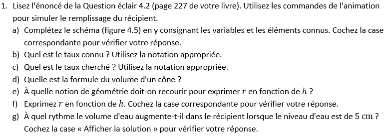 À l’aide d’un environnement 3D interactif, cette animation permet de visualiser le remplissage d’un récipient conique présenté à la question éclair 4.2 et d’en identifier chacune des composantes. Elle met l’accent sur les liens existant entre les variables en jeu ainsi que sur leur rôle dans les calculs amenant à la résolution du problème.