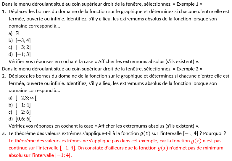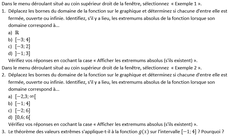 Cette animation démontre pourquoi il faut considérer le domaine d’une fonction dans la recherche des extremums absolus. Le graphique d’une fonction est affiché et deux points agissant comme bornes du domaine sont déplaçables. Vous pourrez ensuite vérifier la présence d’extremums.