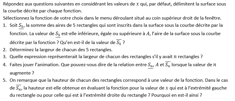 Cette animation permet de visualiser, à l’aide d’un choix de fonctions croissantes ou décroissantes, l’effet de l’augmentation du nombre de rectangles sur la précision de l’approximation de l’aire sous une courbe. L’interface permet à l’utilisateur d’augmenter facilement le nombre de rectangles et lui présente côte à côte les résultats des approximations données par l’utilisation de rectangles inscrits et circonscrits ainsi que la valeur exacte calculée à l’aide d’une intégrale définie.