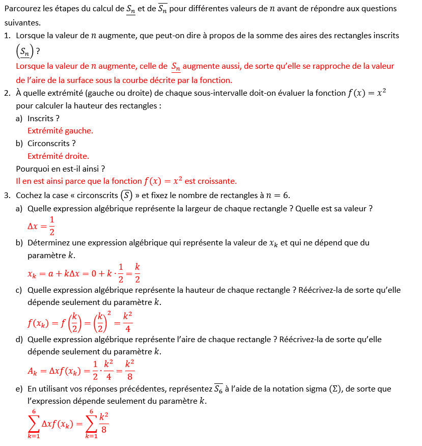 L’objectif de cette animation est de clarifier la démarche algébrique menant à l’obtention des approximations d’aires sous une courbe à l’aide de rectangles inscrits et circonscrits. En effet, parallèlement avec la représentation graphique de l’exemple 1.6, l’utilisateur pourra effectuer des liens avec cette démarche et verra plus facilement la généralisation à effectuer lorsqu’on prend n rectangles.