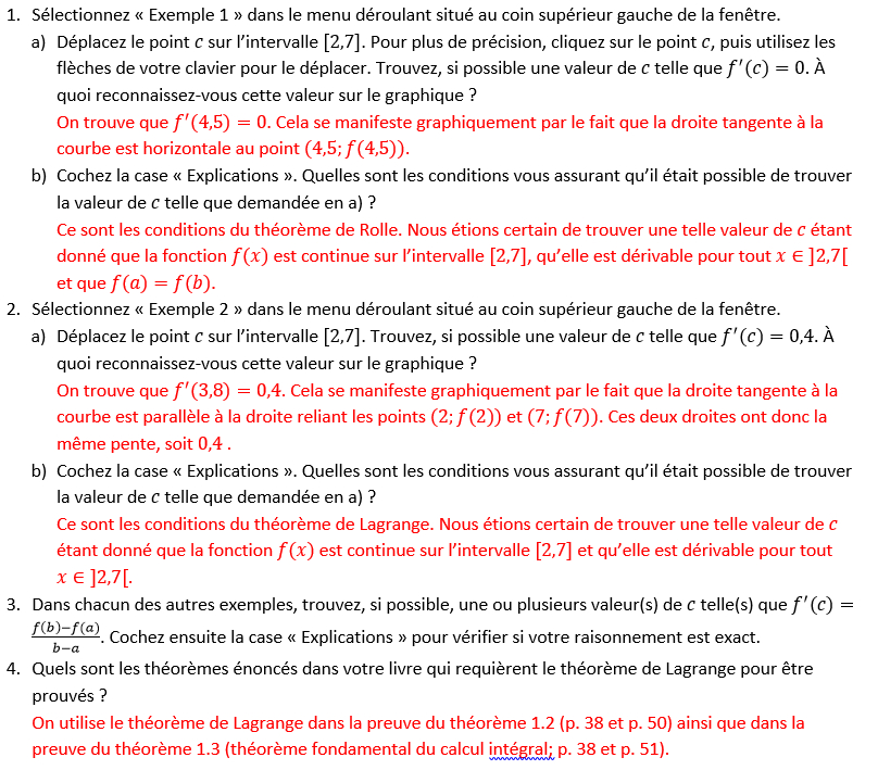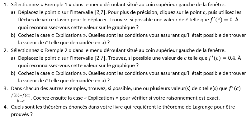 Cette animation vise une compréhension approfondie du théorème de Lagrange. Dans une démarche graphique et ludique, l’utilisateur est invité à manipuler un curseur afin d’identifier un point ayant une pente particulière. Cette exploration par de multiples exemples mène à une réflexion à propos des différentes conditions d’application du théorème.