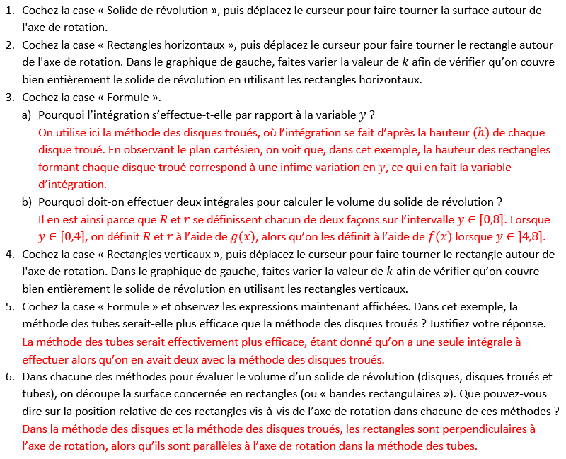 Cette animation permet à l’utilisateur de mieux comprendre le choix de l’orientation des rectangles dans le calcul du volume du solide de révolution. En effet, l’utilisateur, après avoir choisi l’orientation des rectangles (horizontaux ou verticaux), peut manipuler la position d’un rectangle sur la surface et le faire tourner autour de l’axe, ce qui lui permettra d’identifier plus facilement la méthode correspondante (disques, disques troués, tubes) et l’impact de son choix sur le calcul.