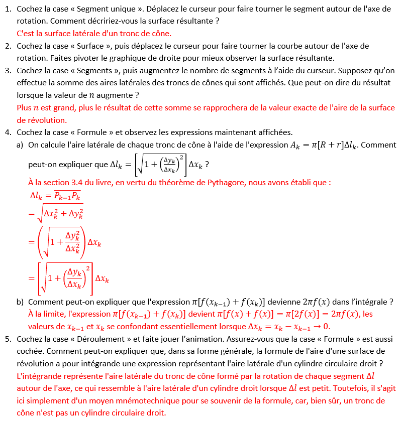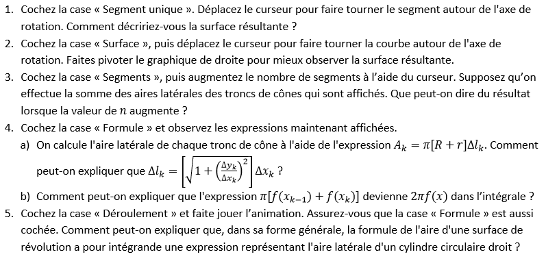 Illustration du concept d’une surface de révolution ainsi que de la formule utilisée pour en calculer l’aire. Tout comme celles qui traitent du volume d’un solide de révolution, cette animation permet de visualiser la surface de révolution et celle du tronc de cône obtenu par la rotation d’un segment de courbe. De plus, elle permet aussi à l’utilisateur de dérouler ce tronc de cône afin de mieux comprendre l’origine de la formule.