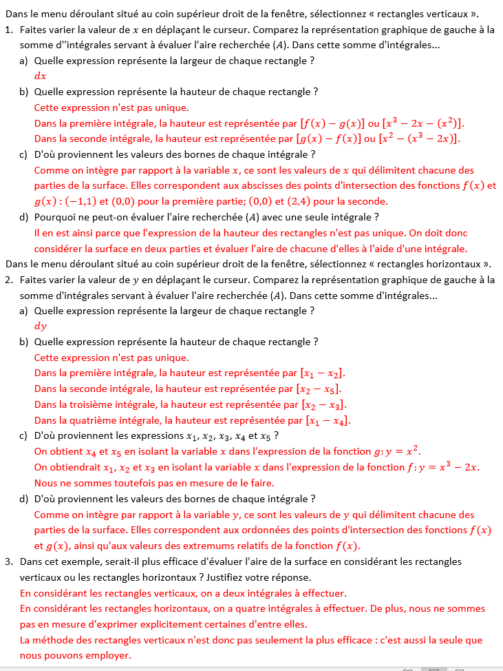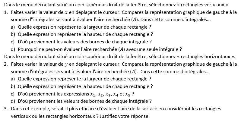 Dernière d’une série de trois animations qui visent à expliquer le choix entre les bandes verticales ou horizontales pour le calcul de l’aire de la surface comprise entre deux courbes. En particulier, cette animation reprend les données de l’exercice récapitulatif 4h) de la page 196. L’utilisateur est encouragé à manipuler le graphique, à explorer les deux possibilités et à effectuer le choix approprié.