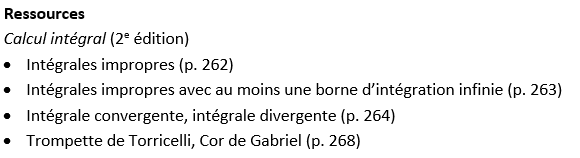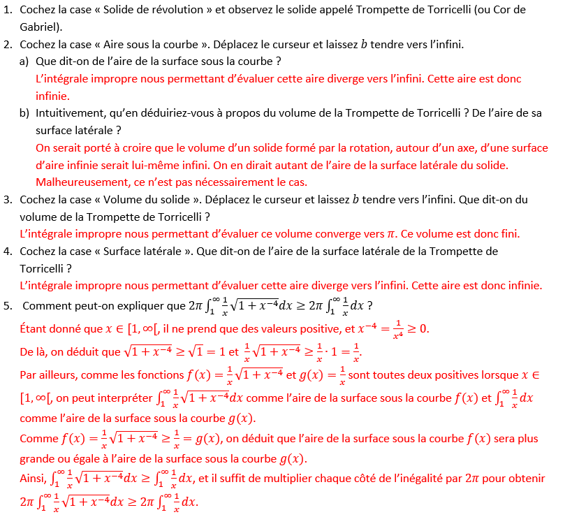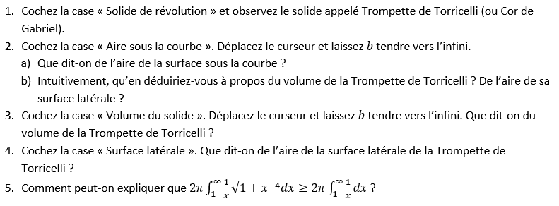 Cette animation reprend les idées présentées dans l’encadré «Un peu d’histoire» de la page 268 à propos d’un objet mathématique ayant des propriétés surprenantes et paradoxales: la trompette de Torricelli. L’utilisateur aura la possibilité de visualiser l’aire de la surface sous la courbe, le volume du solide ainsi que l’aire de la surface latérale. Il verra ainsi des exemples d’intégrales impropres convergentes et divergentes.