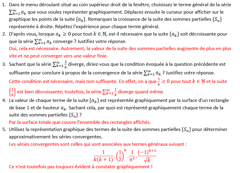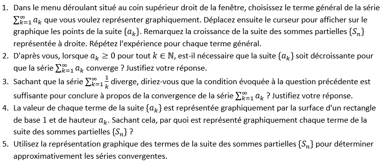 Cette animation reprend la structure de l’animation 21 tout en mettant l’accent sur la compréhension de la notion de convergence d’une série. À l’aide de divers exemples, l’utilisateur manipule l’animation en considérant une série comme une somme d’aire de rectangles dont la base mesure 1 et dont la hauteur correspond au terme général. De manière graphique, la convergence ou divergence devient plus facile à constater.