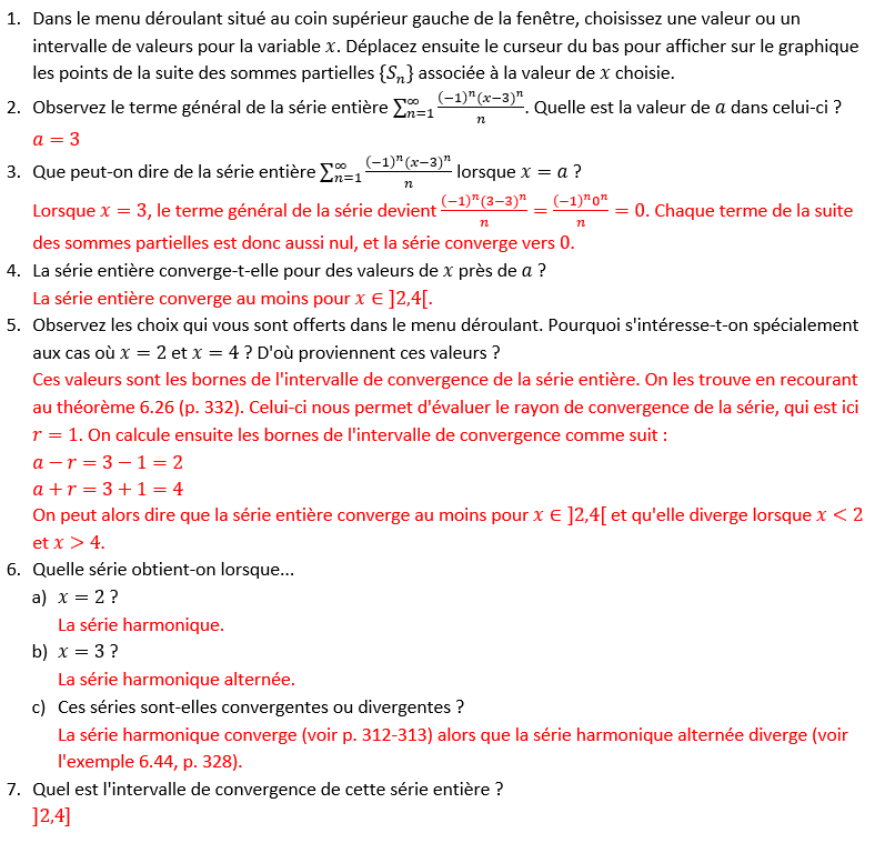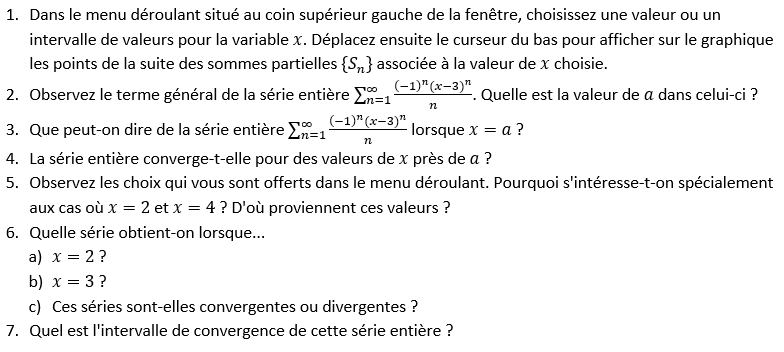 Clarification de la distinction entre une série constante et une série de fonctions (séries entières). À l’aide d’un curseur contrôlant la valeur de la variable indépendante, l’utilisateur peut constater l’influence de celle-ci dans la convergence de la série. Par le fait même, l’animation permet de visualiser plus facilement l’intervalle de convergence de ce type de séries.